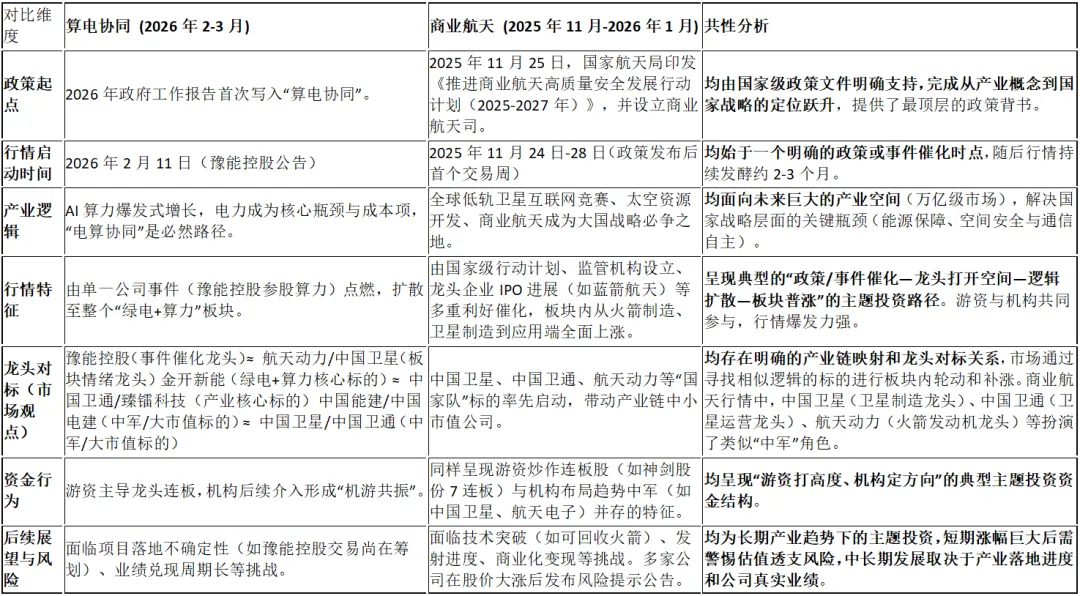 2026年初的“算电协同”行情,是典型的由市场资金推动预期发酵,然后个股事件点火催化、产业趋势确认、国家政策加持三者共振催生的主题投资案例。其演进路径与2025年底的商业航天行情高度相似,均体现了A股市场对于国家级新质生产力方向的敏锐捕捉和集中定价。