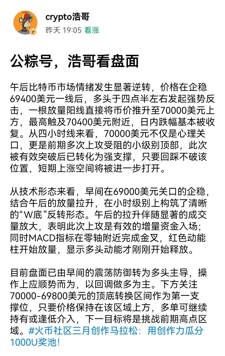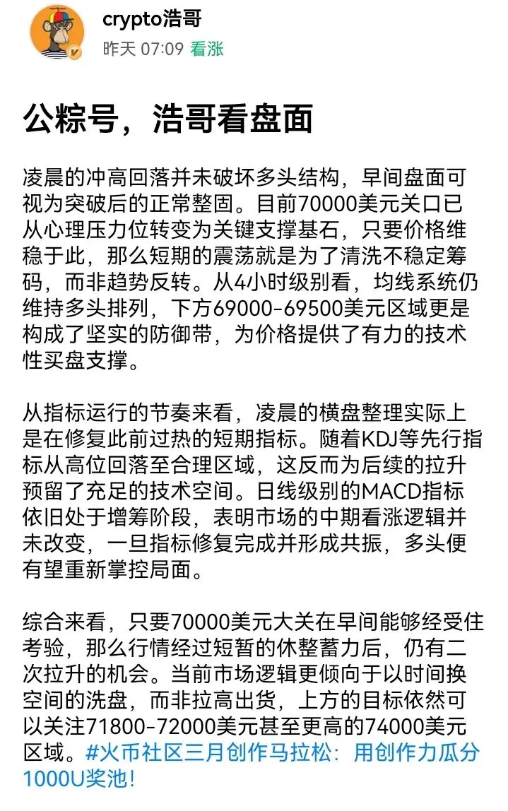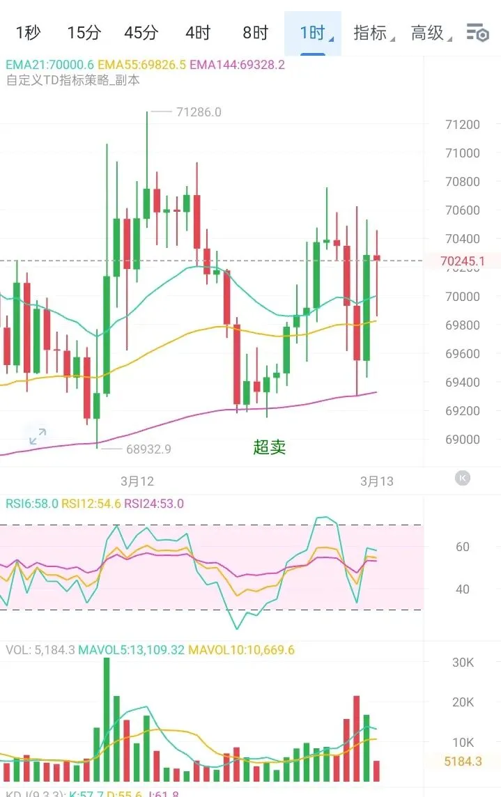 从技术形态上看,经过昨晚的冲高回落再拉升,70000美元关口已历经多次考验,从最初的压力位转变为当前的多空分水岭,支撑效力不断增强。目前价格在70200附近运行,处于所有短期均线系统之上,小时级别均线呈多头排列。MACD快慢线在零轴上方完成修复后再度形成金叉,红色动能柱温和放量,RSI指标处于60-70的强势区间,为后续继续上攻预留了充足空间。