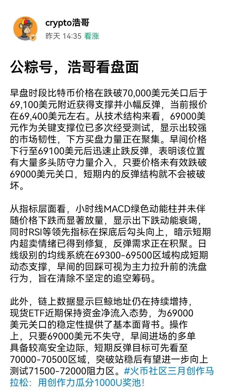 昨晚比特币走势展现出了极强的独立性与韧性。尽管美股三大指数大幅低开,宏观情绪偏空,但币价仅在短暂冲高至70000美元上方后小幅回踩69300美元,便迅速企稳并发动了更强劲的第二轮上攻,再度站稳70000美元大关。在美股大幅低开的压力测试下,币价不仅没有跌破早间的关键支撑位,反而在69300美元形成了更高的低点,这强化了69000-69300美元区域的底部支撑结构,证明该区域已成为多头牢固的防线。
