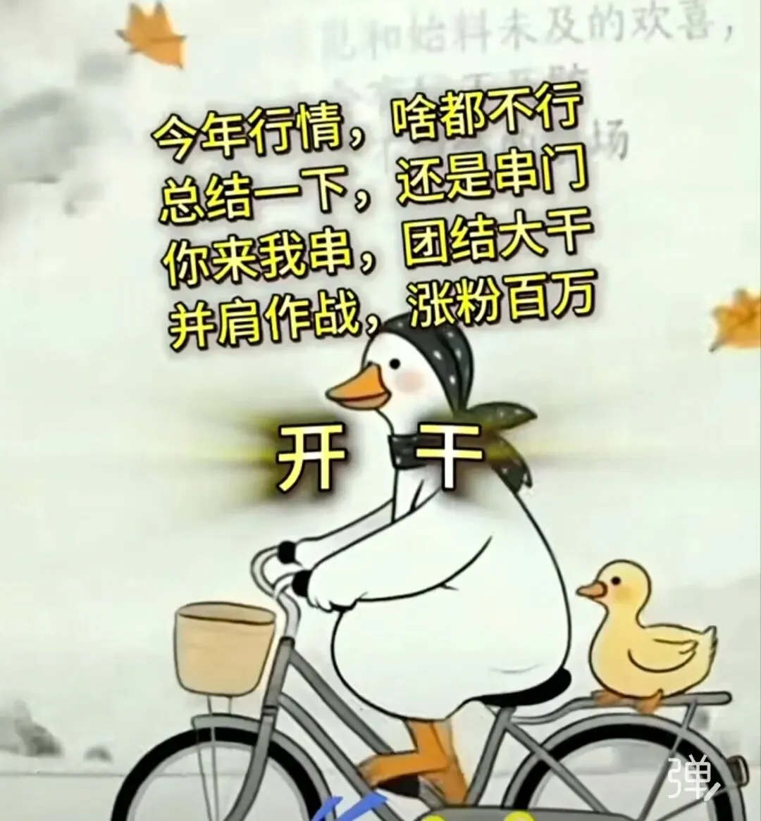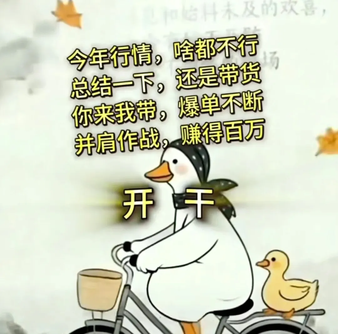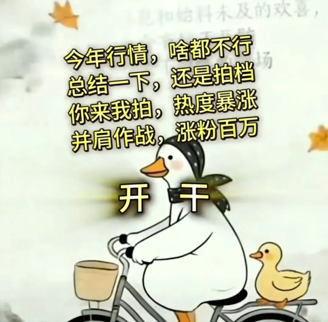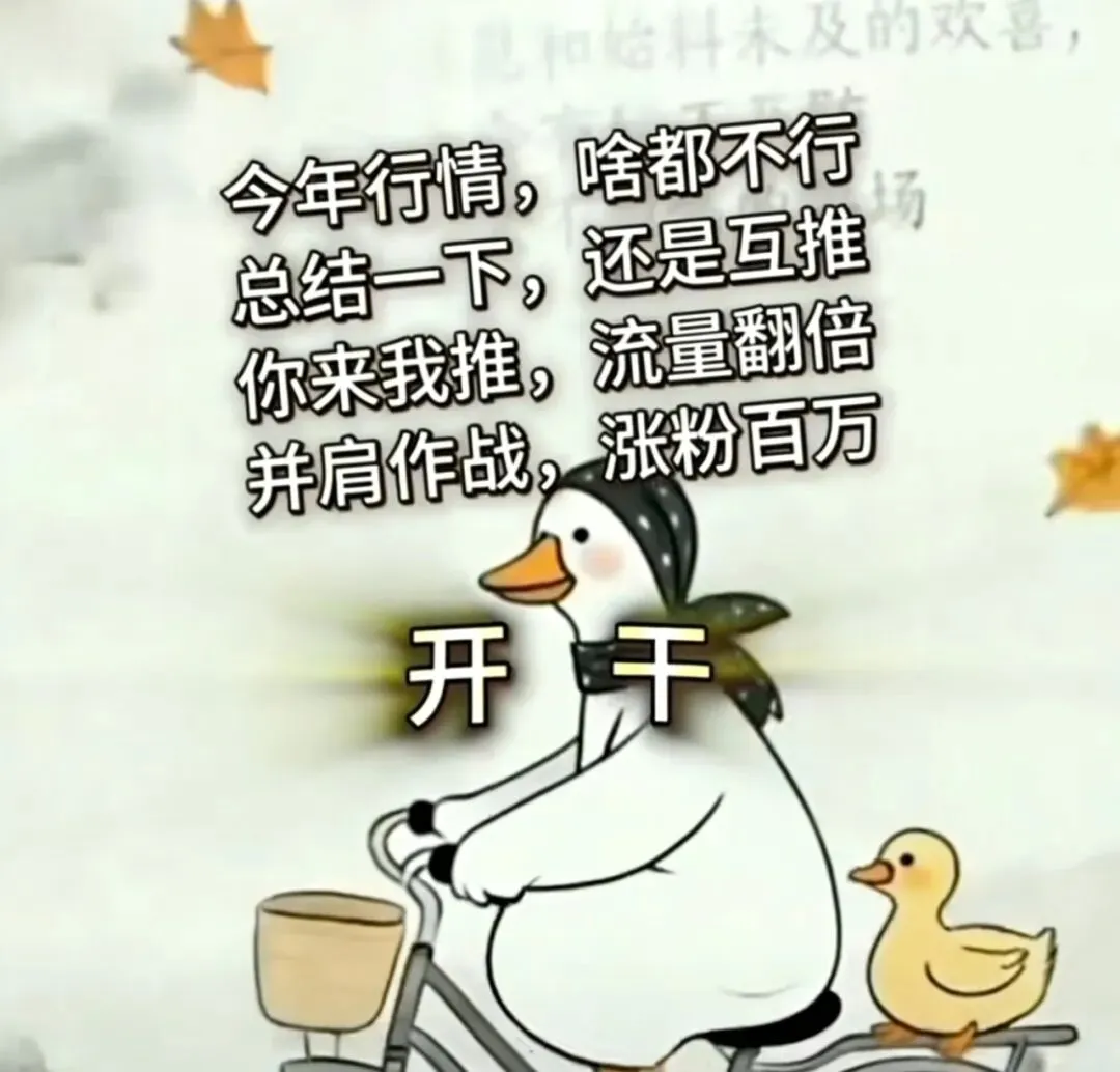 最近刷到一张特别戳人的表情包:一只戴着头巾的大白鸭骑着自行车,后座载着小鸭子,配文直白又扎心——“今年行情,啥都不行,总结一下,还是串门,你来我串,团结大干,并肩作战,涨粉百万”,最后还配了两个字:开干!