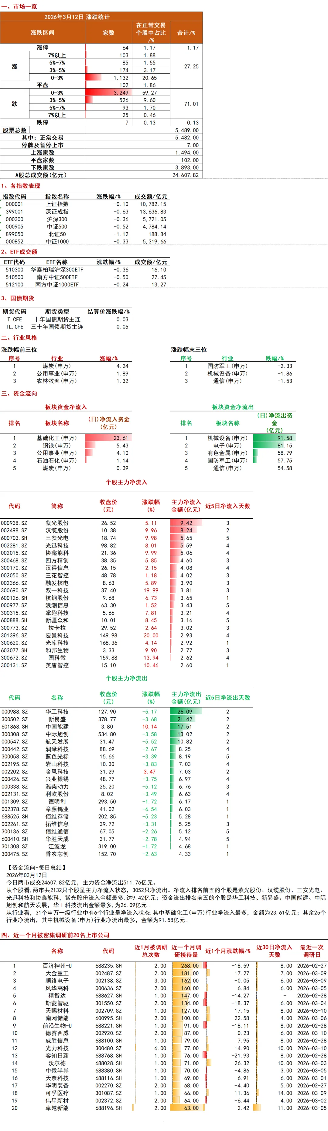 ·主力资金流向:三安光电(13.64亿元)、中国铝业(9.75亿元)、紫光股份(9.42亿元)获主力净流入居前;北向资金成交2961.78亿元,占比12.13%,寒武纪、紫金矿业、工业富联为沪股通成交前三。