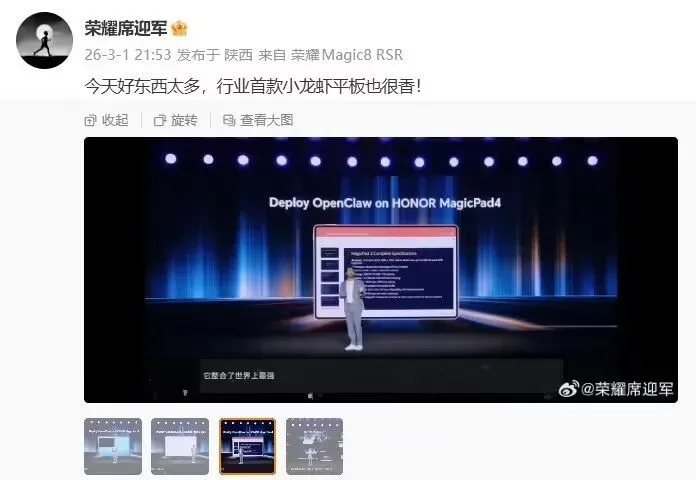 荣耀这次把龙虾直接给官方标配了,而且手机、平板、PC、其他产品,全部都能够用上龙虾。