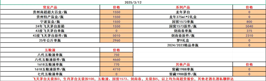 酒水主要为飞天茅台以及五粮液,范围还包括:国窖1573、剑南春等。购买酒水需注意是否包盲盒,以及要注意不要买到海外版本等。