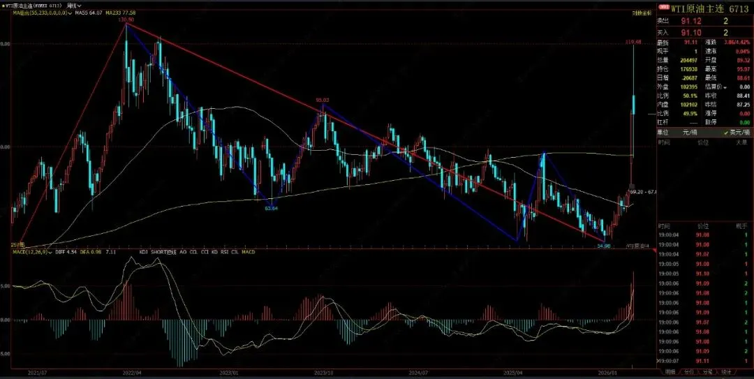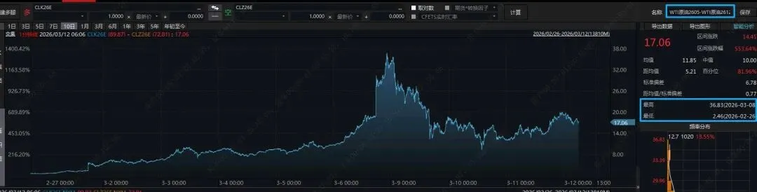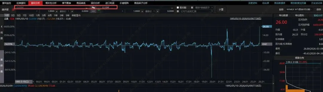 3月9日油价见顶,WTI主力合约CL2604一度冲击120块,跨期价差也同时见顶。