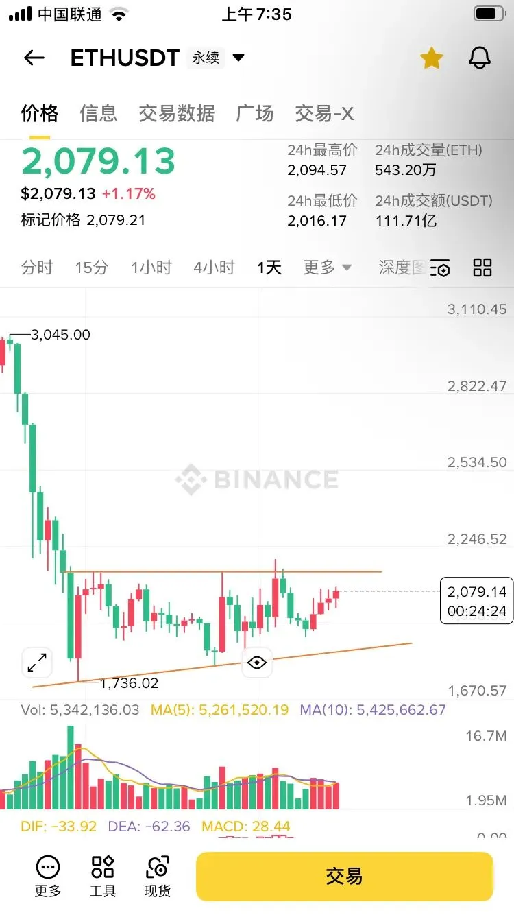 以太坊行情目前行情依然在这个日线的三角区间在震荡,目前对于以太坊可以围绕2040-2030附近做多,这里短线目标可以看压力位置2150这里,如果有效突破2150这里的压力位置,而且4小时回踩2150这里确认突破有效,这里可以继续做多,目前可以上看2500附近