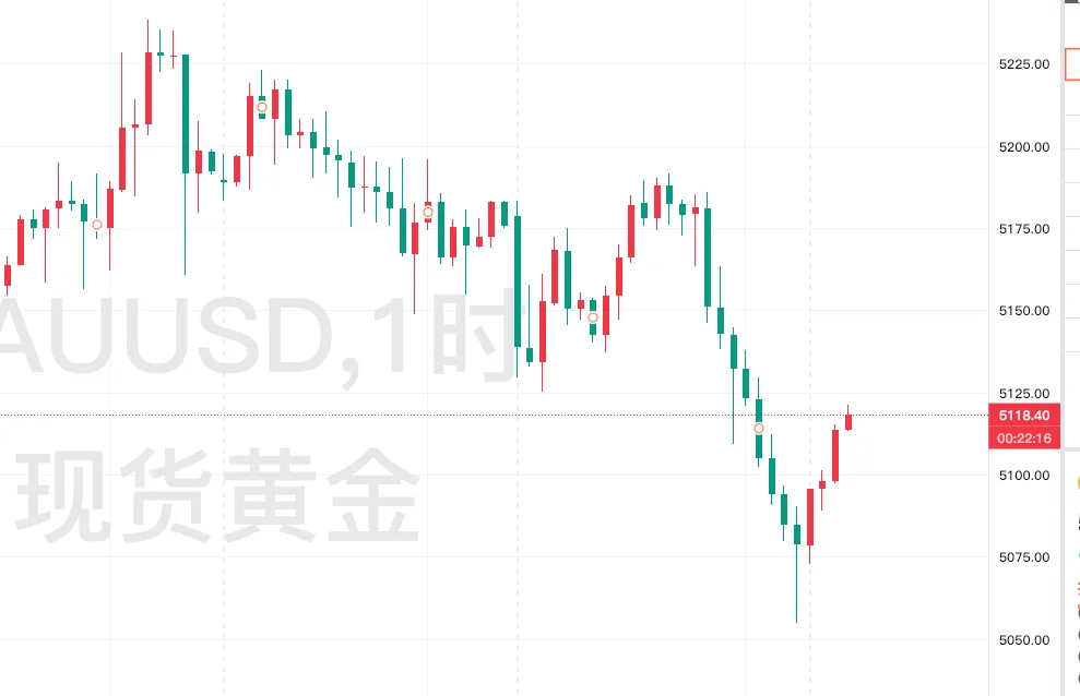 亚市早盘低开后震荡下行,触及5073美元/盎司后反弹,形成短期小级别反弹趋势,但反弹量能持续萎缩,未能形成有效突破,当前价格在5118美元/盎司附近震荡整理,多空双方暂时处于僵持状态。分时图显示,短期支撑位为5100美元/盎司整数关口,若跌破该位置,可能再次回调至5073-5055美元/盎司区间;上方短期阻力为5120-5130美元/盎司区间,突破后方可进一步打开回弹空间。