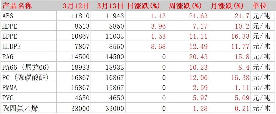 产品名称 | 3月12日 | 3月13日 | 日涨跌(%) | 周涨跌(%) | 月涨跌(%) | 单位 |