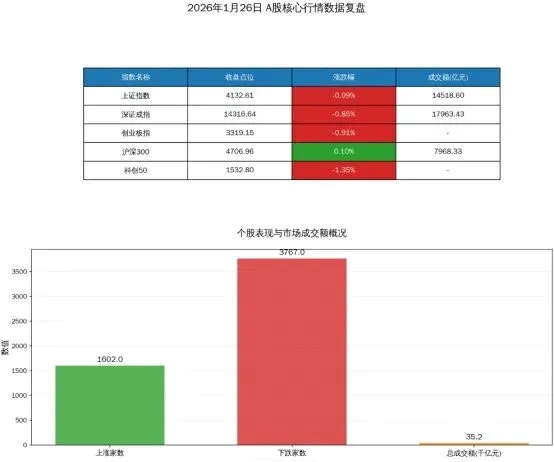 2026 年 1 月 26 日 A 股呈现 “权重护盘、个股普跌” 的极致结构性分化,核心矛盾是中特估大盘股的流动性虹吸效应,防御性板块受资金追捧,题材股全面失血,赚钱效应降至近期冰点。