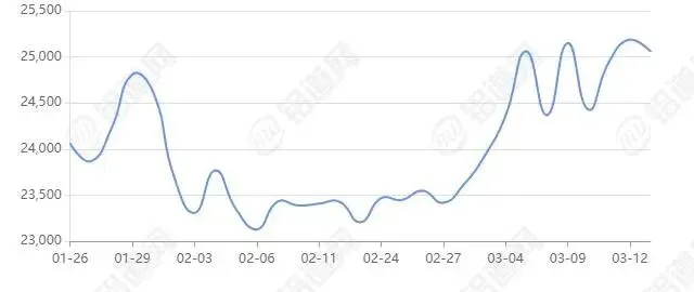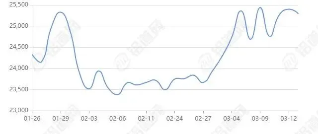 2026年03月13日上海期货行情价25195涨跌-50,最低25115,最高25270,前三日均价24876,前五日均价24799。