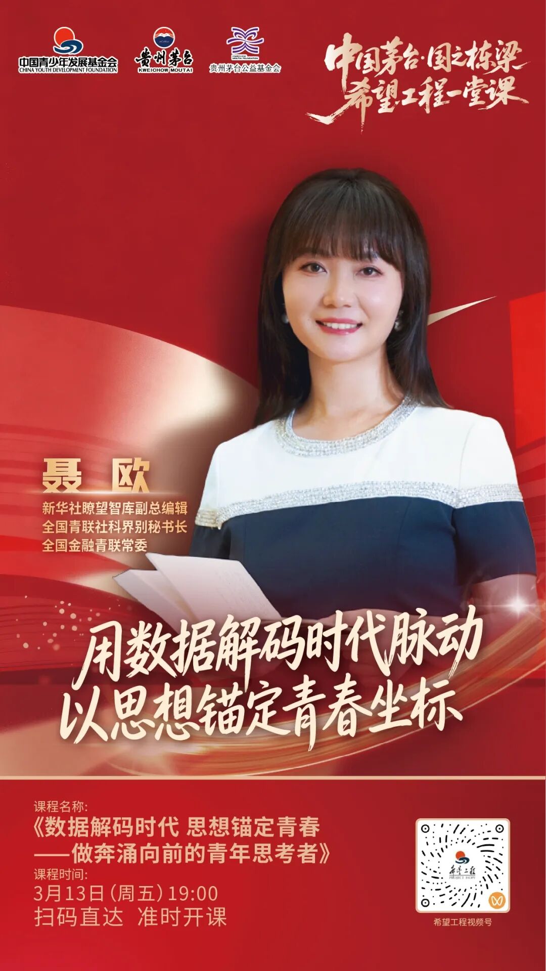 据希望工程报道, “中国茅台・国之栋梁” 希望工程一堂课第五期,将于3月13日19点开播。新华社瞭望智库副总编辑聂欧将登上本期课堂,以《数据解码时代 思想锚定青春 —— 做奔涌向前的青年思考者》为题分享成长与研究故事。