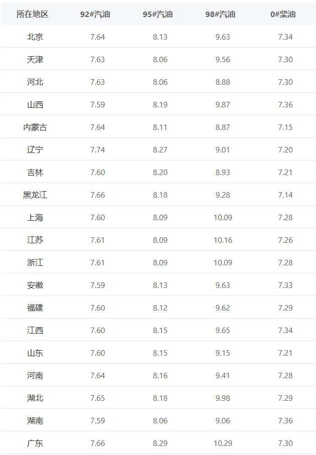 今日汽油油价通知: