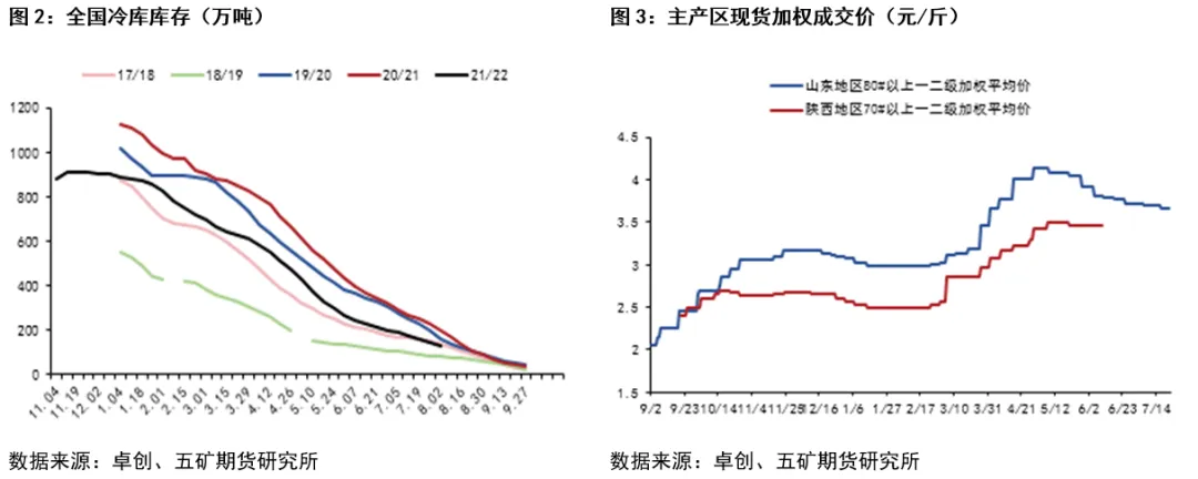 受去年优果率偏低影响,入库总量维持低位,虽今年消费偏差,但整体库存水平偏低。据卓创统计,截止7月21日当周,全国冷库库存126万吨,环比降低15万吨,库存总量偏低,好果较少,支撑库存果价格维持高位,对盘面有一定支撑,但在新季产量争议较大背景下,支撑力度减弱。
