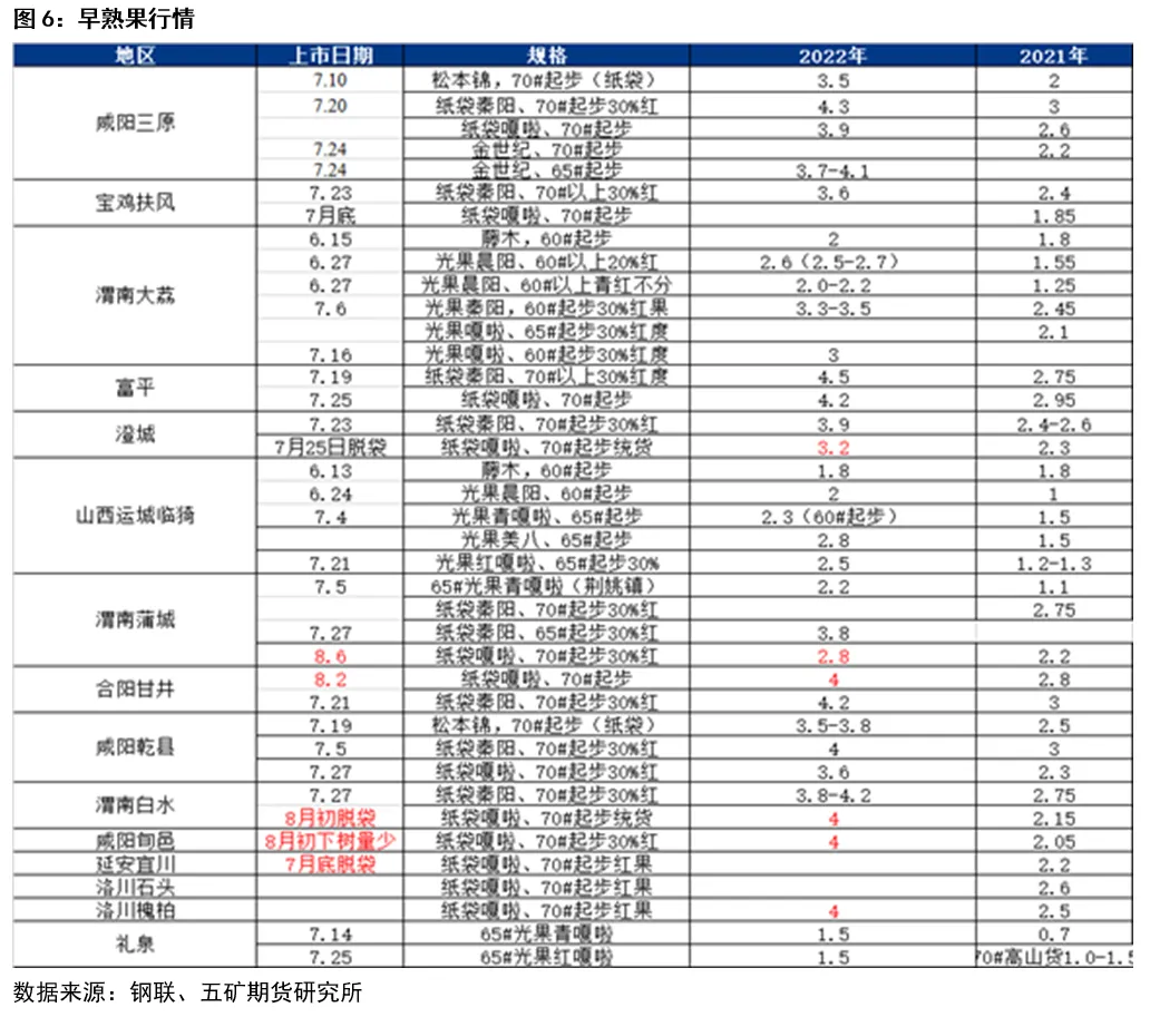 近期纸袋嘎啦少量下树交易,八月为嘎啦交易高峰期。目前近富县、三原及乾县等少量光果嘎啦上市交易,开称价同比高1块左右,目前仅少量上市,价格维持稳定。8月白水等地嘎啦将陆续下树,销售期能持续至九月,此时已较为接近晚富士下树时间,因价格有一定连续性,因此我们认为嘎啦后续行情对晚富士开秤价预期有一定影响。若随着嘎啦大量下树,价格尚能维持高位,或小幅涨价,则将明显提振晚富士开秤价预期;而若大量上市后,价格一路走低,则不利于晚富士开称价提升。