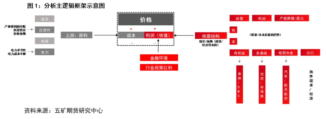 价格由成本及利润估值两部分组成。其中,生产成本是价格的基准线,利润估值则是在成本基础上,市场综合品种自身供需结构、国内外经济环境以及行业政策红利等多方面因素,所给予到成本之外的价格溢价。除此之外,由于金属硅本身高能耗行业的属性,叠加全国“双碳”及能源转型的大背景,相关能控政策亦是对金属硅价格产生重大影响的因素之一。