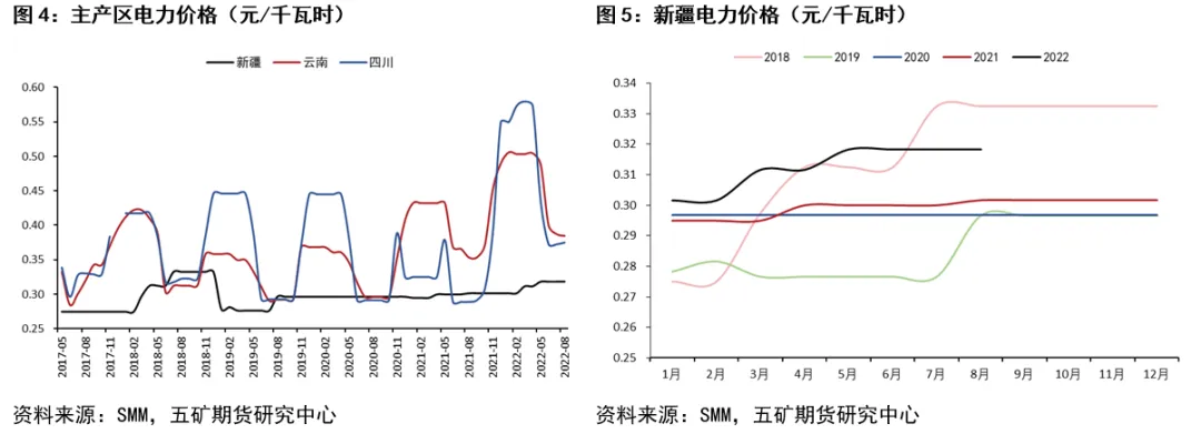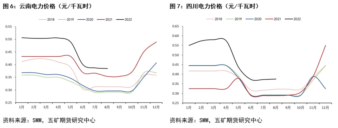 从历史数据来看,云南近四年丰、枯水期平均价差为0.08元/千瓦时,折合对成本影响为1000元/吨;四川近四年丰、枯水期平均价差为0.13元/吨,折合对成本影响为1650元/吨。