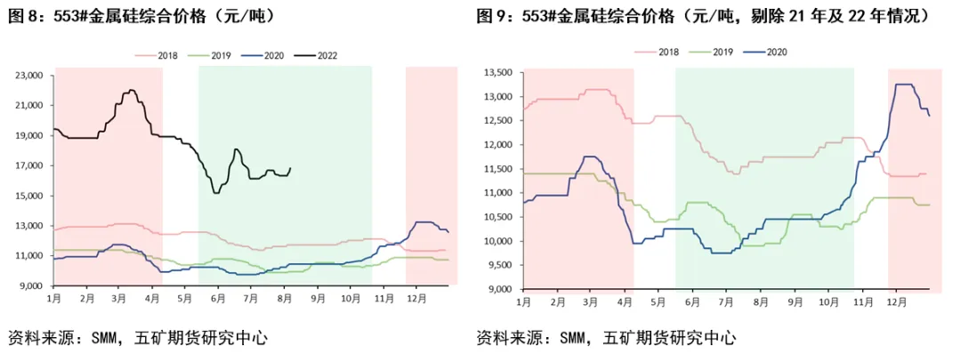 电力成本的季节性对应到金属硅价格,金属硅价格随着丰、枯水电价季节性变化也呈现出同样的季节性变化走势,价格波动幅度在1000-2000元/吨,与电力成本的季节性变化幅度相匹配。