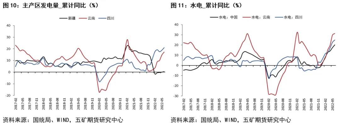 电力成本高低主要取决于全国电力的整体供需结构。电力供给端,得益于今年整体降水量同比改善,水利发电同比出现大幅提升,主产区中云南及四川发电量显著增加(图10)。