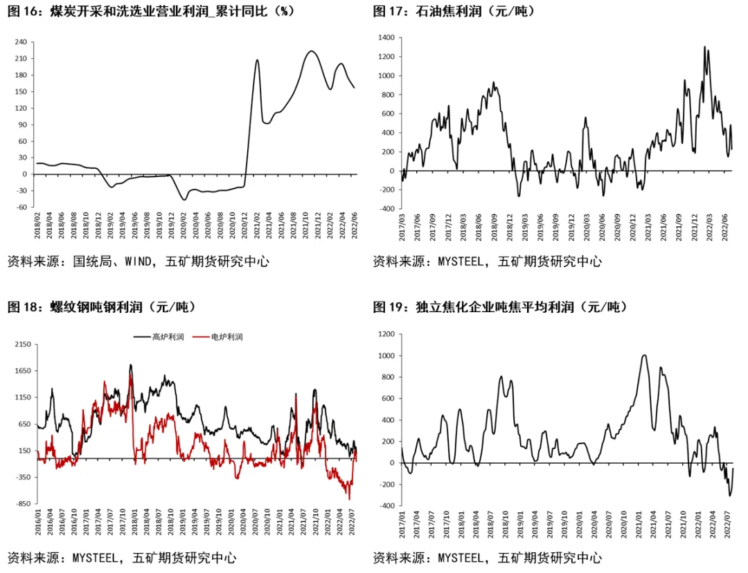 而下游需求端,随着制造业,尤其房地产需求的快速下滑,煤炭下游以螺纹钢为代表的钢材端利润开始迅速恶化走差。此外,焦化企业受下游钢铁行业利润走差影响,也开始由盈利转为亏损。