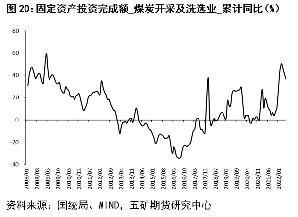 除此之外,为防止2021年缺煤导致的煤炭价格大幅上涨情况再度发生,国家自2021年四季度开始积极推进煤炭端“保价稳供”工作,大力增加煤炭供给端投资。从统计局公布数据看,2022年1-6月份,中国煤炭开采及洗选业投资累计同比增速达36.5%,投资增速显著增加。