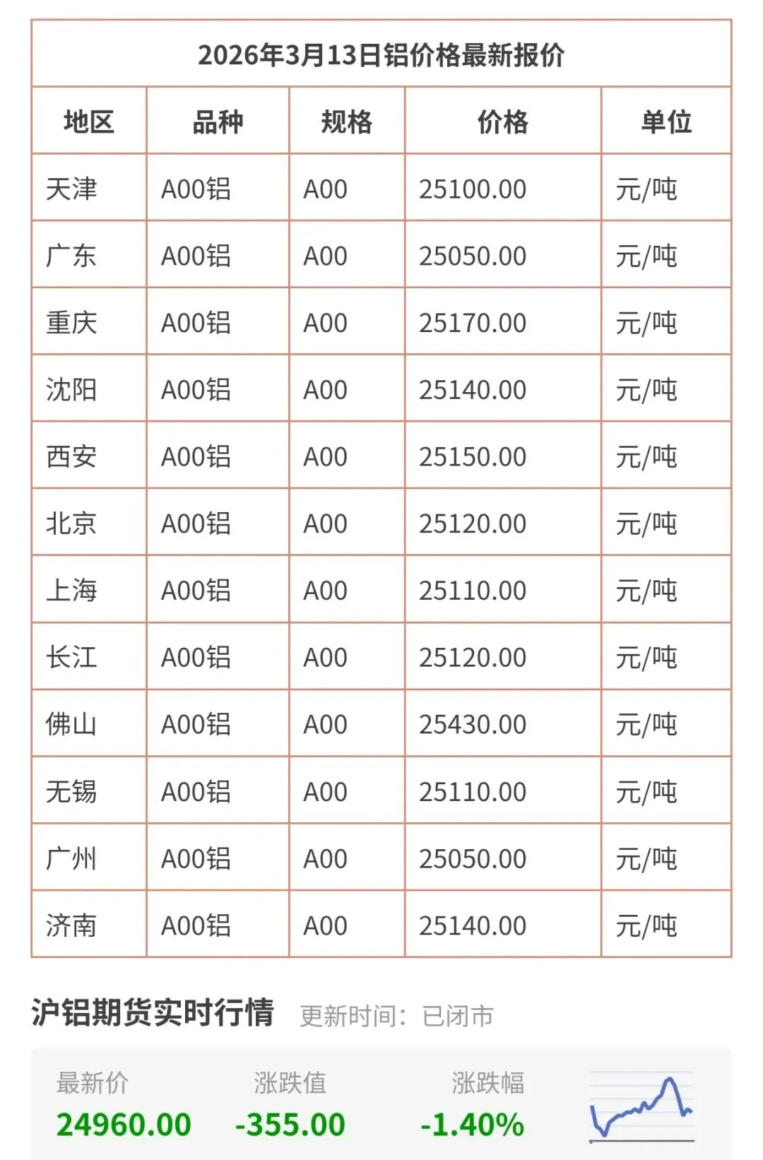 今天3月13日更新,今日铝价行情查询,包括天津、广州、上海、北京、无锡、广东、佛山等地区铝现货价格!长江有色铝锭最新价格是多少钱一公斤一览表