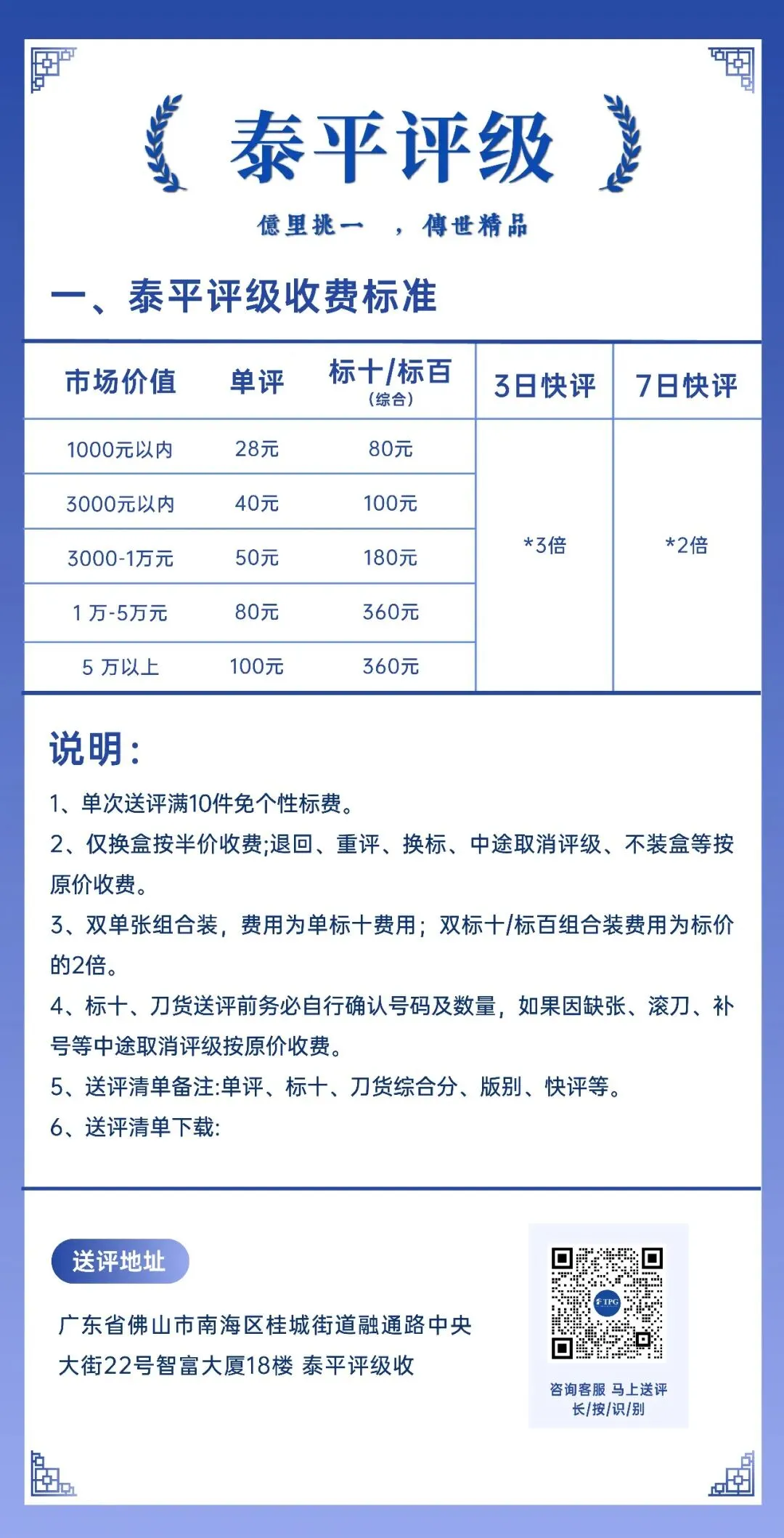 3. 个性标费用:若单次送评满10件藏品,可免个性标费用。如果单独送评1张且需要个性标,则需额外支付个性标费用(折后同样优惠)。