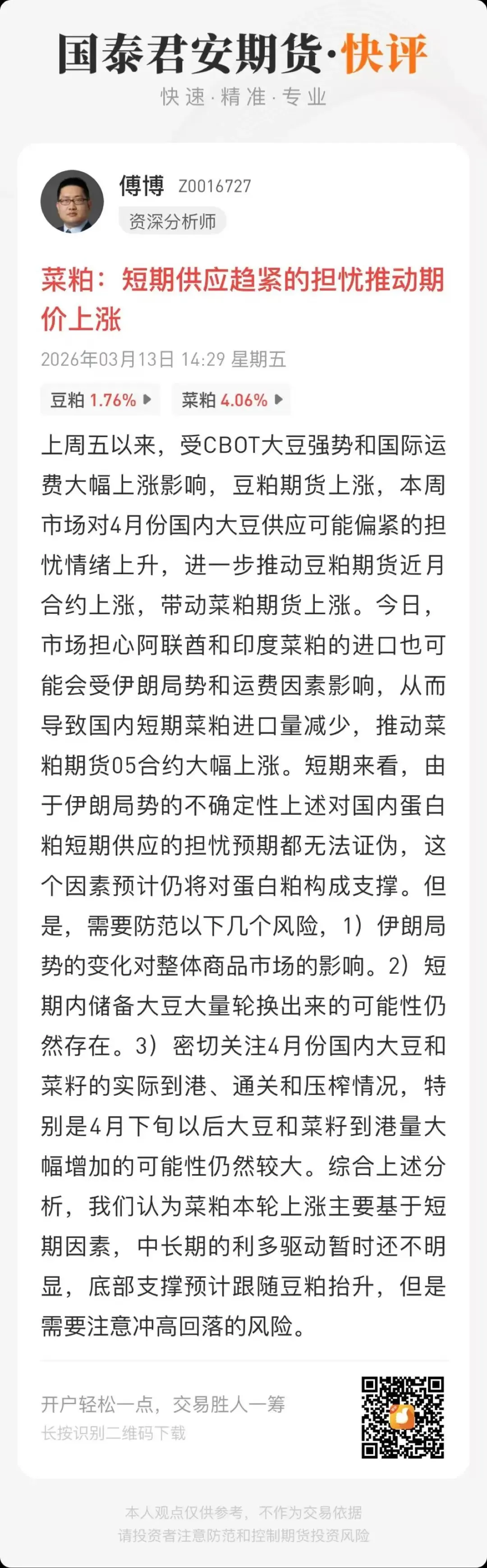 根据《证券期货投资者适当性管理办法》,本报告发布的观点和信息仅供国泰君安期货的专业投资者参考。若您并非国泰君安期货客户中的专业投资者,为控制投资风险,请取消订阅、接收或使用本报告中的任何信息。本报告难以设置访问权限,若给您造成不便,敬请谅解。请您根据自身的风险承受能力自行作出投资决定并自主承担投资风险。