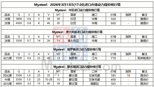 13日进口市场动力煤价格暂稳运行。今日市场交投延续冷清趋势,市场需求疲软,报盘基本持稳运行,其中Q3800巴拿马船型FOB主流报价区间为60-62美元/吨。而国内市场难有提振,终端拿货意愿较低,流标现象频发,致市场情绪受挫,实际成交困难。随当前回国海运费高涨,到岸成本高企下国内贸易商接货能力有限,叠加传统用煤淡季影响明显,短期内出现大规模集中采购概率依然较小,市场暂缓操作,静待观望。预计短期内进口动力煤市场仍以稳运行,后市需持续关注终端采购计划及市场实际成交等情况。