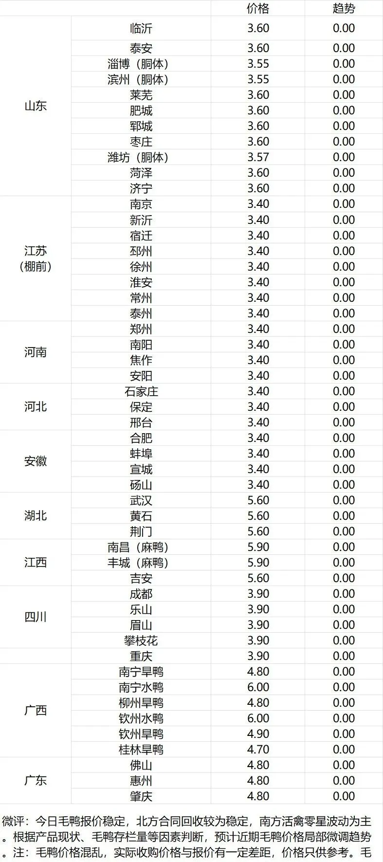 微评:鸭苗报价上涨。(注:南方只报当天价格)养殖端担心后期成本高企,交投逐步走快,拉动市场情绪好转。根据产品、养殖成本及鸭苗现状分析,预计近期鸭苗价格呈震荡上行趋势。种蛋报价涨5分。温馨提示:该价格为主流厂家报价,实际销售价格以成交价格为准,价格仅供参考。