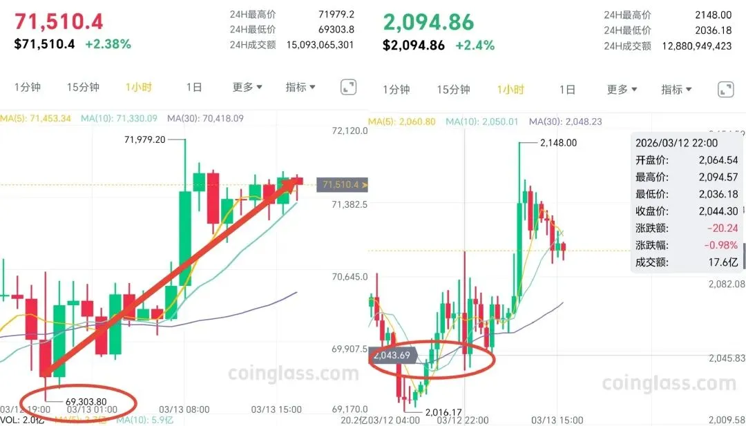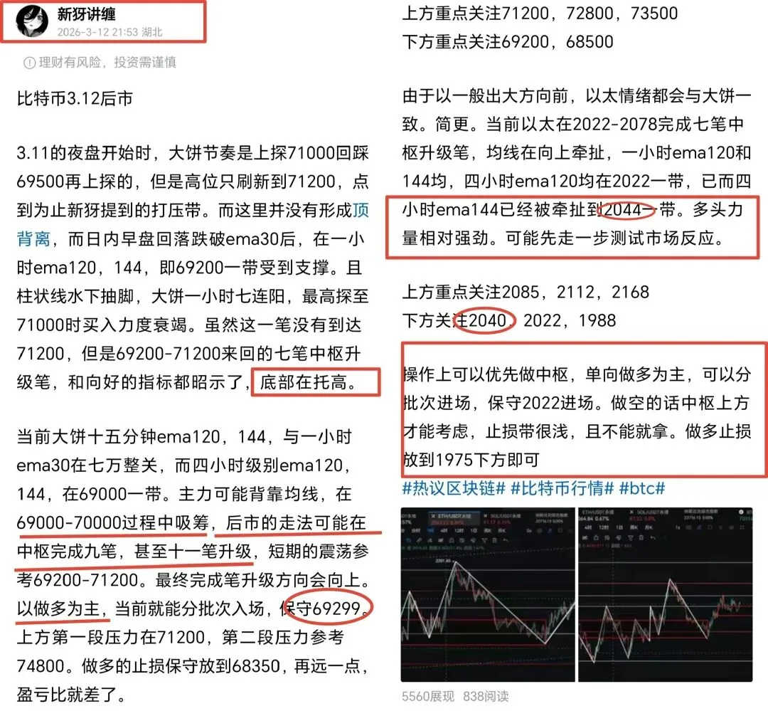大家晚上好,我是新犽,当前一周踩的极好。关于昨天的思路,大饼是不是又踩到了69300底部呢。包括以太的2044均线也成了阶段逼仓点。说过了底部托高,多头强劲,市场恰是如此。今天有笔空单被打损,中断一周长龙。