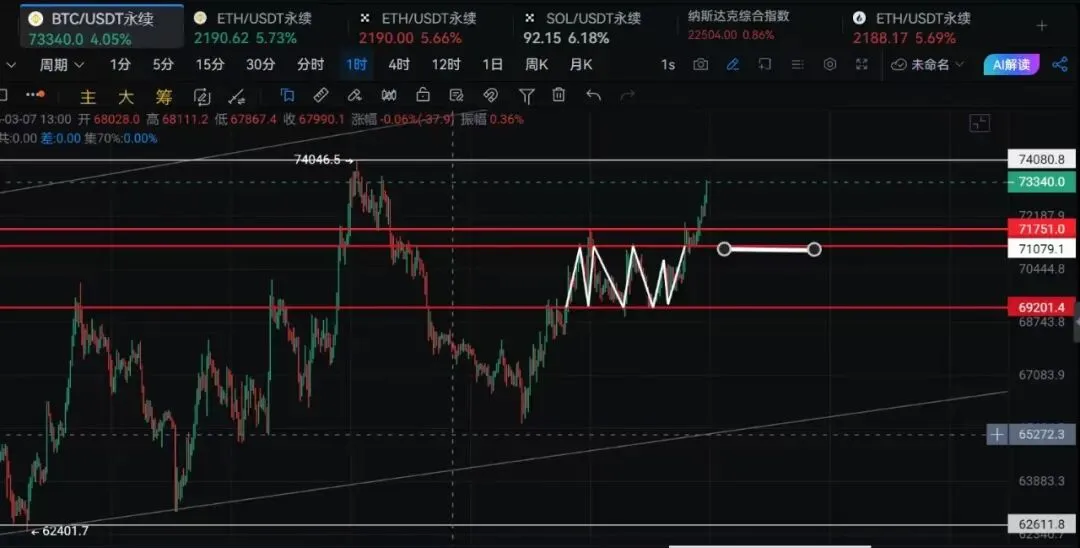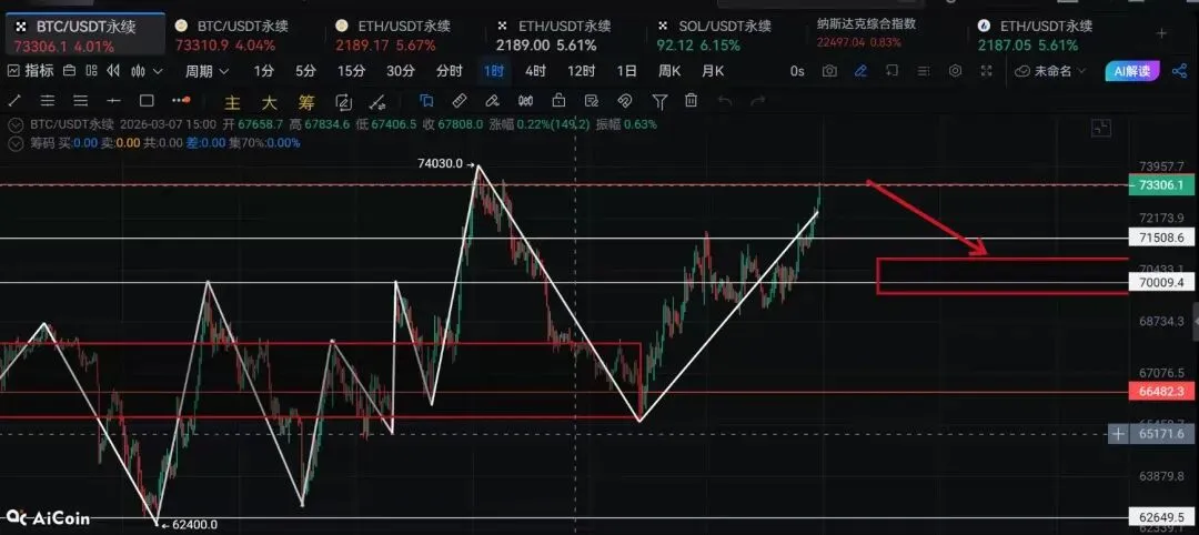 当下适合做左侧,当下先空,现价73200就能空。止损带少一点,放到73800,70800-71200接回多单做锯齿,止损放到70000。