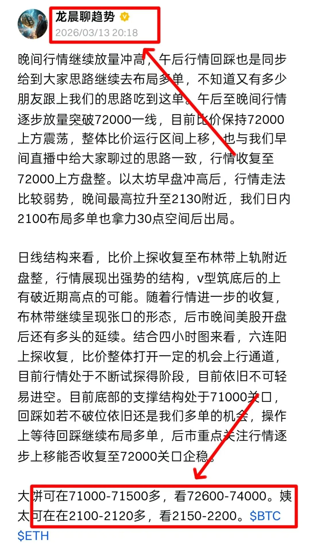 转眼间一周工作日时间已经过去,不知道这周朋友们收获如何。还是简单一下日内行情,早盘大饼收线后冲高上探,比价一度打破此前承压位置71000一线,延续上探至72000一线承压,日内白盘回调整筑底71000一线后,晚间迎来二次的放量,比价突破72000关口后,多头延续比价最高拉升至73800附近承压回落。以太坊与大饼一致走势,白盘承压2150一线后,回踩2080一线筑底反弹冲高,晚间二次收复至2200关口承压。日内我们早盘抓回踩扫损一单后,随着行情明了,回踩我们继续布局多单上看,日内大饼总计落袋2800点空间,姨太总计落袋85点空间。
