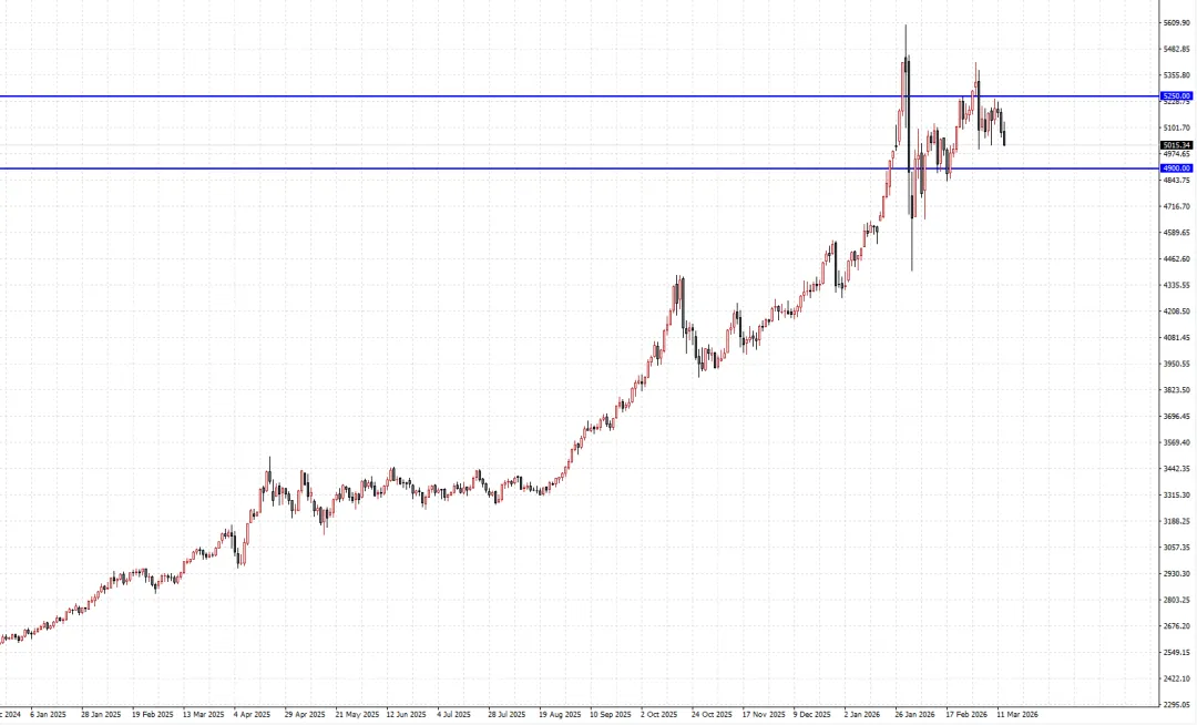 综合而言,黄金当前正处于“美元强劲+共识认可”的组合姿态,多重诱因组成的典型框架为金价保持高位区间整固提供底层逻辑。当前黄金交易市场的主线逻辑清晰:尽管在金价波动上呈现分歧,但认可央行购金,实际利率下行,地缘风险是构成黄金配置的共识性底层逻辑,而极端看涨或看空交易行为需保持紧惕。与此同时,与黄金与美元指数的联动逻辑密不可分,美元短期走向将取决于通胀与就业数据的“双线发展”,该数据将决定美联储的的政策耐心与市场对其降息前景的预期,并打破当前的平衡格局,成为推动行情进入关键节点的“导火索”。市场接下来更可能把注意力放在几个变量上:美国通胀与增长数据是否支持进一步宽松;美联储内部对“鹰派”基调是否进行强化;以及地缘风险是否出现新的升级或缓和信号。从运行逻辑的角度,黄金的“更大级别上行叙事”仍可成立,但短线需要面对的不是“有没有利多”,而是“利多是否已经被计价,以及流动性是否允许价格顺畅表达”。当保证金与成交结构发生变化时,价格的波动常常比消息本身更能体现市场的真实压力。若后续流动性恢复、波动收敛,黄金更容易重新回到以宏观利率预期为主导的定价轨道;反之,若不确定性升温或规则变化继续扰动,震荡幅度也可能维持在偏高水平。眼下这轮回撤更像是对市场避险情绪推动价格快速上涨的技术性再平衡,而非对黄金长期逻辑的否定。同时既是在消化避险流动性与规则调整带来的短期冲击,也是在等待下一轮宏观与风险变量给出更清晰的方向线索。技术层面上,黄金看涨的积极前景依然完整,价格走势当前则更偏向于典型阶段性“上行受阻-下行不深”的约束性窗口期。因此,多头若可开启新一轮强势姿态,并位于5250美元区域之上再度巩固底仓,则通过量能与动能共振推动二次上攻,有望带动金价再度上行测试顶部收市平台区5400美元目标。然而,需要谨慎的是,中东地缘政治紧张局势引发能源中断对全球供应链的连锁反应,这可能放大通胀效应并影响美联储路径。总体而言,中东冲突的持久性和油价波动交织美国数据不确定性,使得黄金短期面临美元主导的温和回调风险。此外,从市场定价看,目前利率衍生品市场预计到2026年6月前将美联储将再降息2-3次。简而言之,曲线里仍隐含对额外宽松的期待。然而,如若美国后续经济数据显示韧性,美联储在更新利率路径时口风再度转向“鹰派”,那这些额外宽松预期就需要被“撤回”,收益率曲线将发生“鹰派再定价”。在这一过程中,美元指数将成为受益方。全球风险情绪的反复以及市场对美联储过度宽松的预期,使得美元指数在近期大幅回调。但如果交易员开始相信“降息底部已现”,那么此前积累的悲观交易将面临回补压力,从而也将导致金价再面临后续技术性回调风险。与此同时,如若美伊谈判缓和迹象显现,则市场避险情绪消退将导致金价面临多头回补压力。因此,黄金如若在短期内回收至4900美元区域下方,则仍需紧惕短期技术性回调风险因素显现,从而导致空头节奏强化价格进一步回撤至4650美元区域进行新一轮修正。更为值得谨慎的是,如若4650附近区域未能提供底部托举,则后续金价将面临进一步回撤至4402.25美元低点的风险加剧。