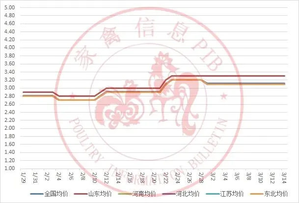 2026年1月29日-2026年3月14日主流地区白羽鸡鸡苗均价走势图