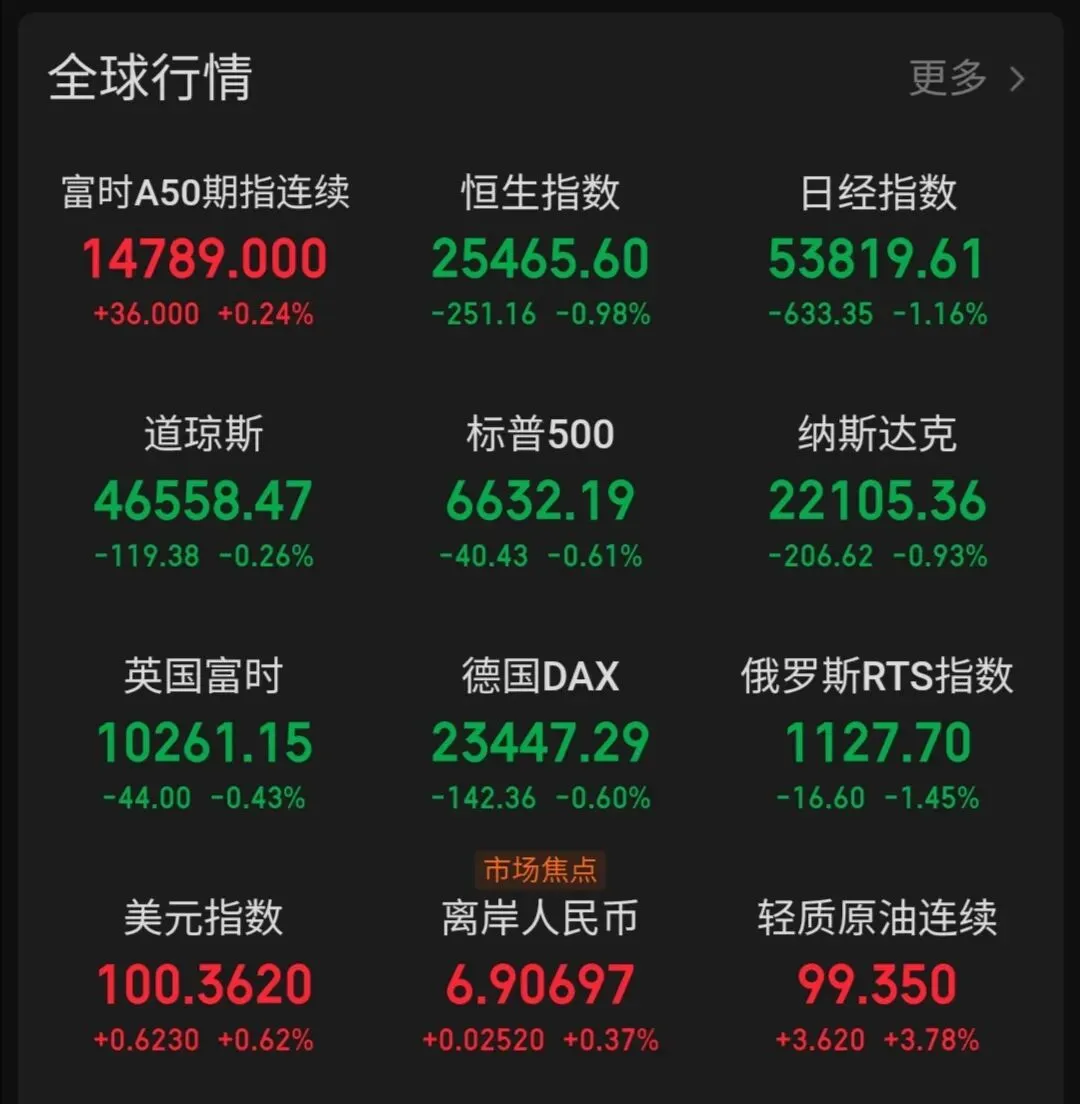 A股开盘:A50下跌+外围普跌,下周一A股大概率低开。重点关注石油、黄金、航运等避险板块能否逆势走强。
