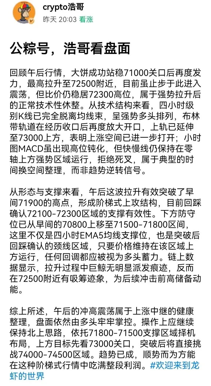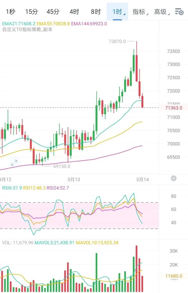 昨晚行情将多空双杀的残酷展现得淋漓尽致,大饼在突破前高触及73888一线后遭遇空头强势反扑,上演经典“黑色星期五”剧情。目前价格已快速回落至71300附近,从高点算起跌幅近1700余点,将近期涨幅回吐大半。从技术结构来看,这波下跌具有较强的破坏性:四小时级别K线在73888形成长上影后连续收阴,已跌破EMA15和EMA30两道短期均线支撑;MACD在零轴上方形成高位死叉且量能柱由红转绿,表明空头动能正在加速释放;布林带方面,价格从上轨直接击穿中轨至下轨附近,若70800一线失守,开口将进一步放大引发更深回调。