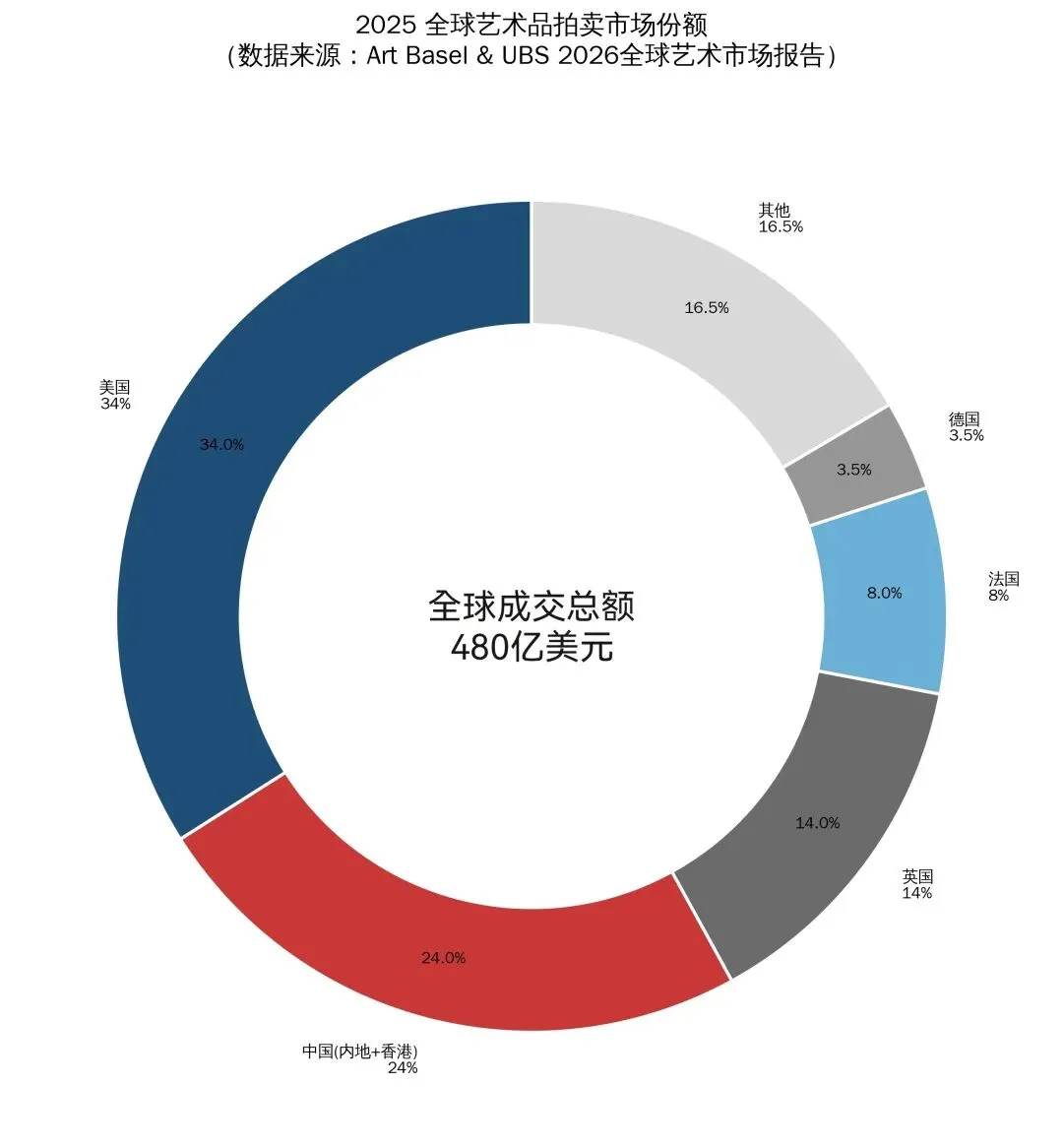 公开拍卖销售额增长9%至480亿美元,千万美元级高价拍品增幅达30%,成为市场核心引擎。在全球格局中,美国、中国、英国合计占据72%份额,中国以115.2亿美元、24%占比稳居第二,内地与香港联动的拍卖板块走出总量企稳、结构优化、品质上行的独立行情,成为全球艺术市场回暖的关键支柱。