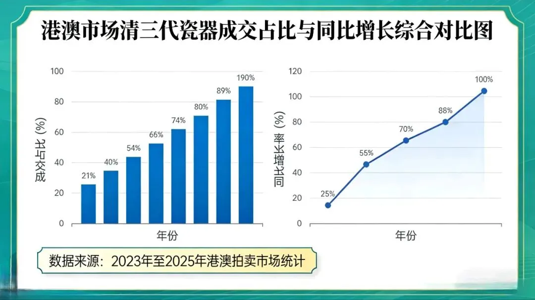 香港作为国际枢纽,艺术板块2025年成交额增至百亿港元,涨幅11%,成交率升至81%;香港宫廷瓷玉、古代书画专场屡超估价成交,头部机构春秋拍成交额同比增长15%—23%,成交率稳定在75%以上,印证高价板块的强劲修复。