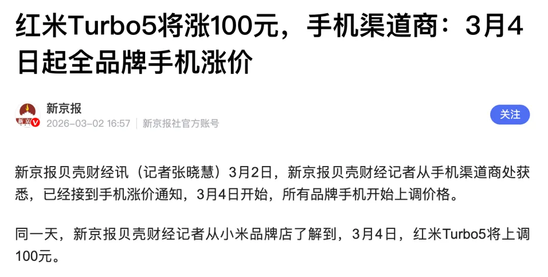 比如REDMI Turbo5的10亿元内存补贴计划已经结束,在3月4日开始上调售价100元。