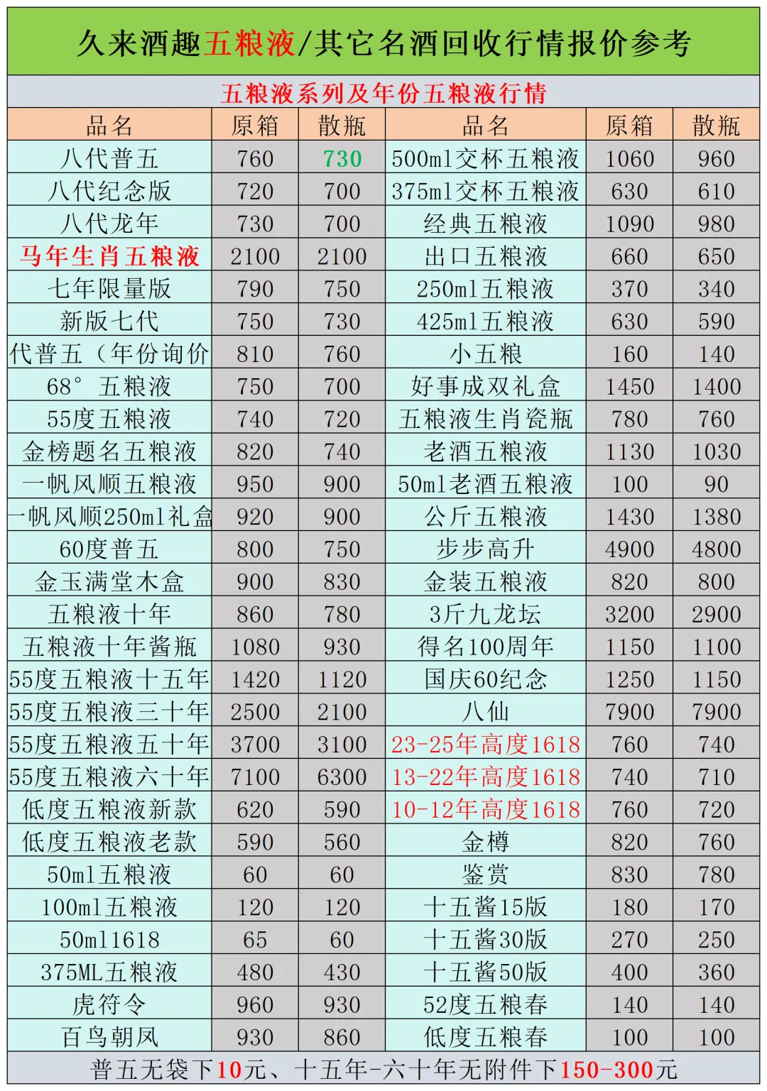 本公众号提供各种名酒回收行情报价,常规茅台、五粮液、洋河、剑南春、国缘等。所有报价根据市场买卖行情总结而来,每天更新最新报价!部分酒水每天涨跌幅较大,无法及时更新请谅解。本报价仅供参考,并非实际成交价格。感谢您的关注!我们会竭尽所能,提供更多更好的服务。