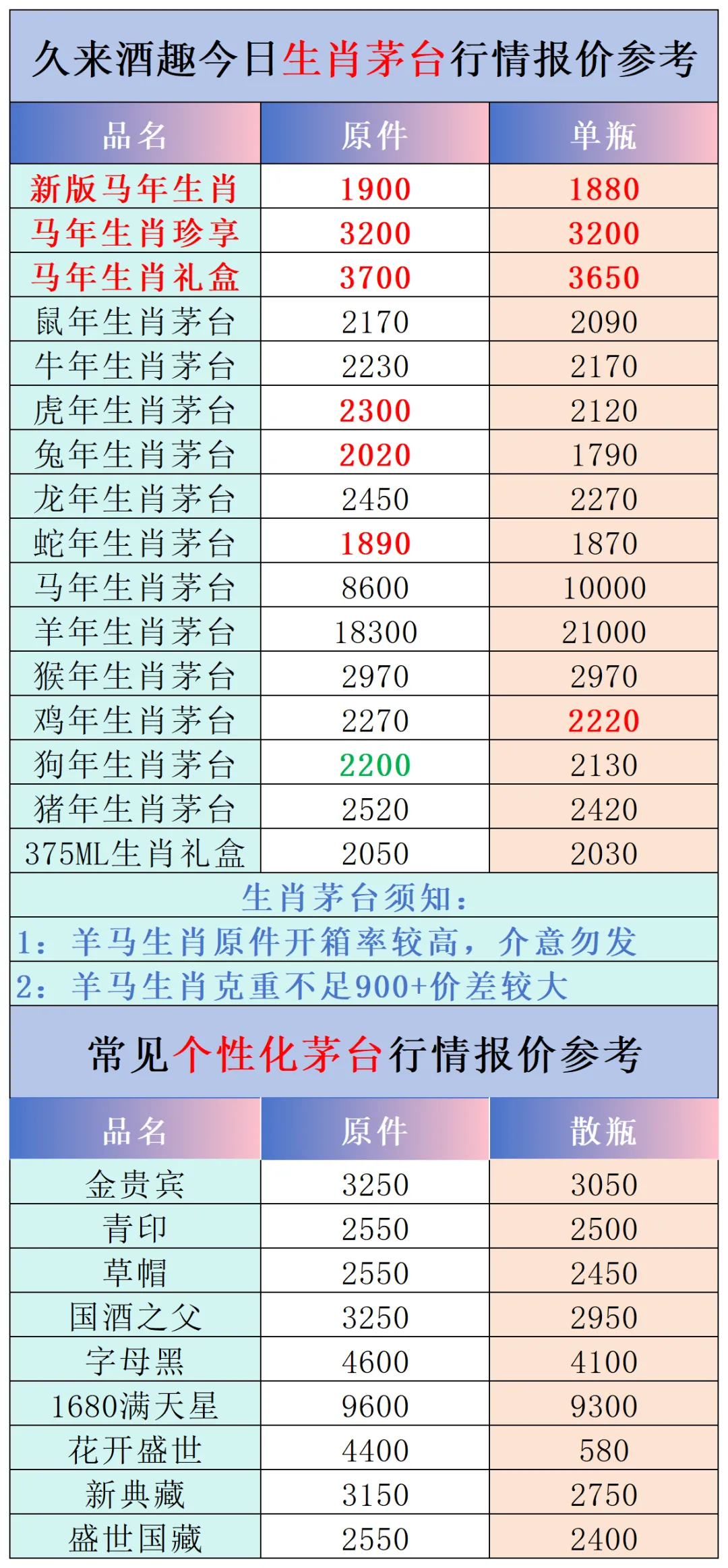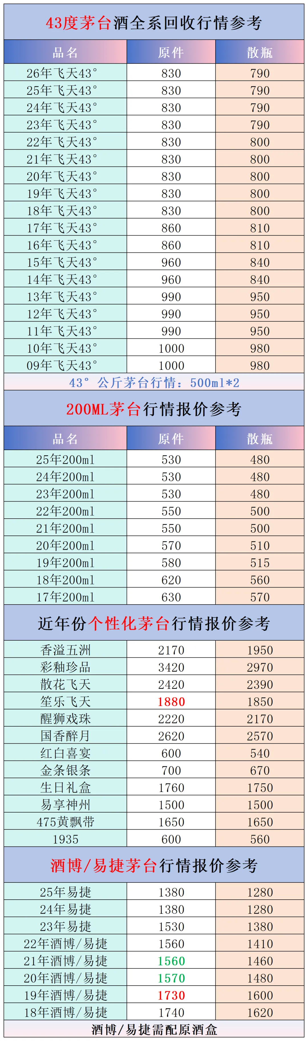 本公众号提供各种名酒回收行情报价,常规茅台、五粮液、洋河、剑南春、国缘等。所有报价根据市场买卖行情总结而来,每天更新最新报价!部分酒水每天涨跌幅较大,无法及时更新请谅解。本报价仅供参考,并非实际成交价格。感谢您的关注!我们会竭尽所能,提供更多更好的服务。
