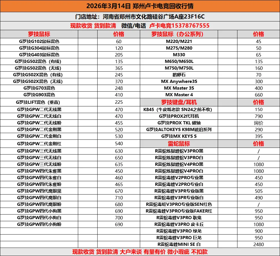 >2026年3月14日 郑州卢卡电竞回收行情