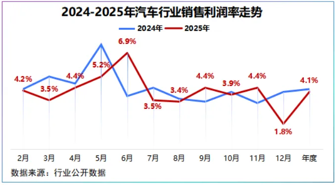 2025年,汽车行业利润率为4.1%,创下近十年新低;其中12月跌至1.8%的历史低值,利润被技术投入、降价、材料成本等因素大规模摊薄。
