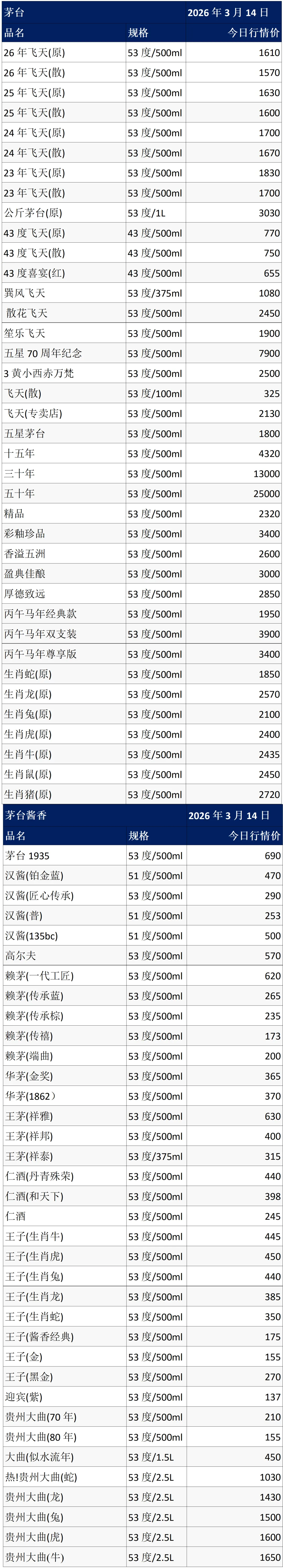 【茅粉情报】3月14日各大名酒批发行情参考价....