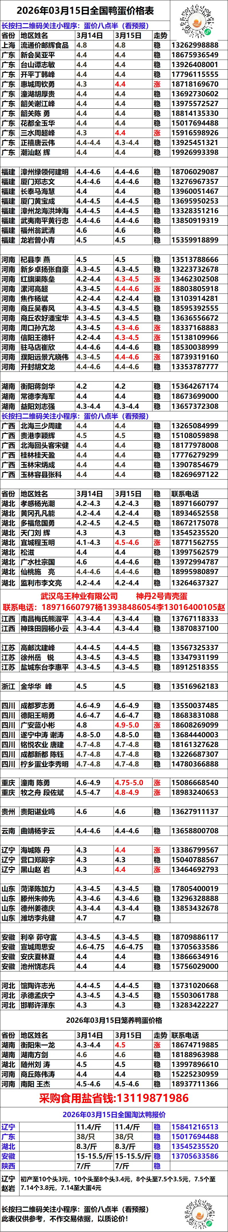 亲爱的读者朋友: 您所看到的《全国鸭蛋价格天天报》数据,并非来自官方统计,而是由一线采购员、养殖合作社代表和鸭蛋生产厂家自发组成的行业联盟共同采集汇总。