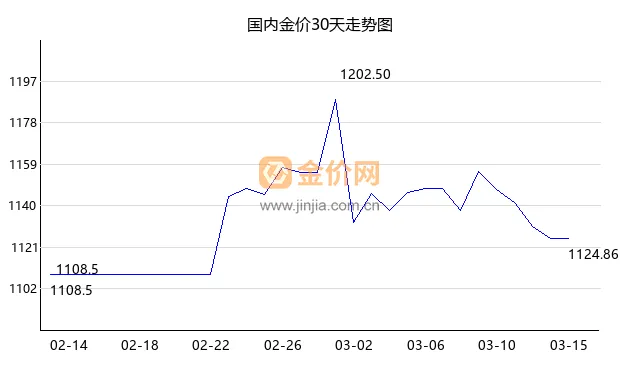 今日国内金价下跌,现价1124.86 元/克,下跌-1.03%,今日开盘价1138.00,最高价1139.02,最低价1120.28。