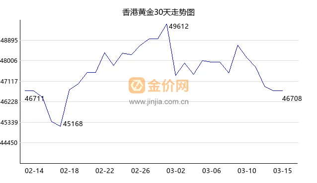 今日香港黄金下跌,现价46708 港币/两,今日开盘价47271,最高价47735,最低价46626。