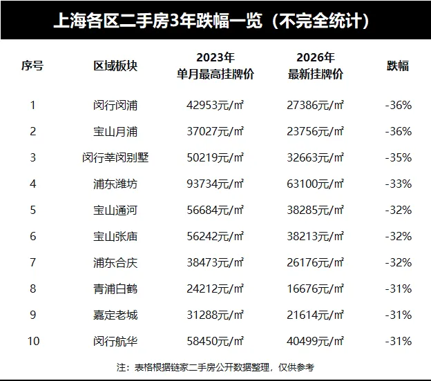 让人意外的是,一些市郊甚至是远郊区域,房价跌幅也控制得很好,包括闵行华漕、松江洞泾、松江新城、奉贤海湾等跌幅也都在-5%以内,比陆家嘴(-8%)、老西门(-8%),甚至南京东路(-11%)还要抗跌你敢信?!
