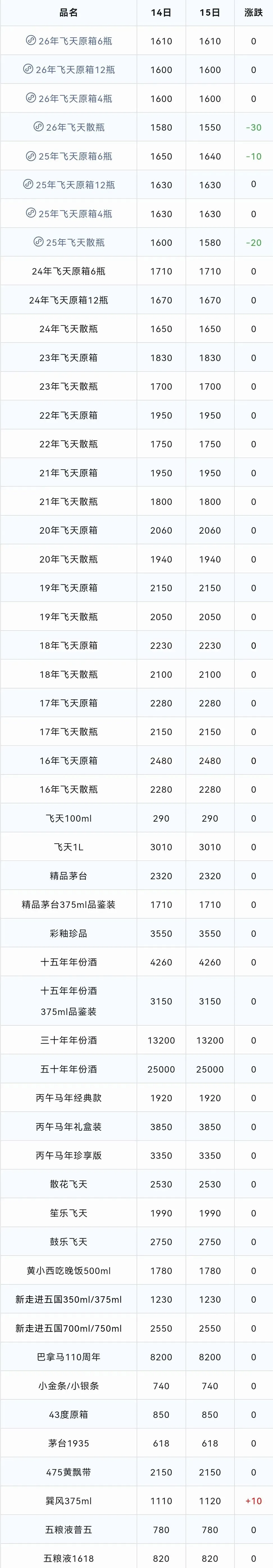 由于公众号平台修改了推送规则,如果不想错过“茅酒顾问”行情价,记得读完点一下“在看”,这样每次新文章推送才会第一时间出现在你的订阅列表里。今日(3月15日),从茅酒顾问发布的白酒价格行情监测数据显示,近段时间整箱茅台价格一直在1550徘徊,散瓶在1540左右,今日53度贵州飞天茅台(500ml)一批价跌至1610元左右!散飞在1550。