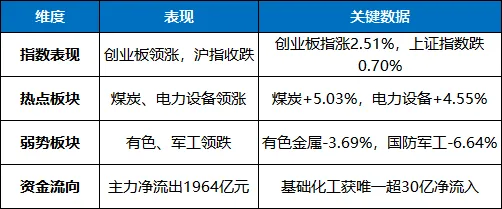 市场轮动核心特征:前期领涨的资源品(有色、石油石化)普遍回调,新能源赛道接力表现,煤炭、公用事业等防御板块受捧,科技股内部分化明显。