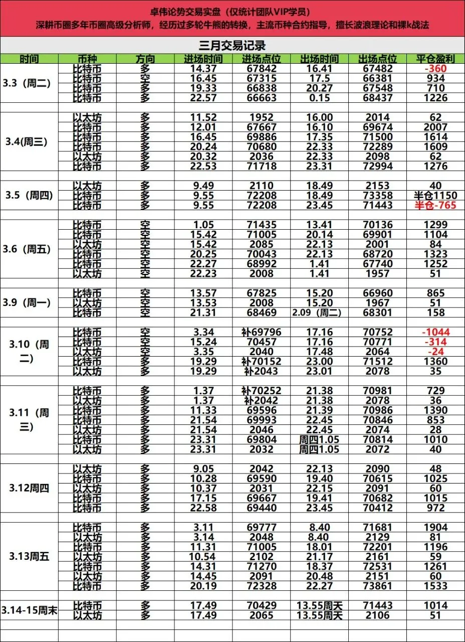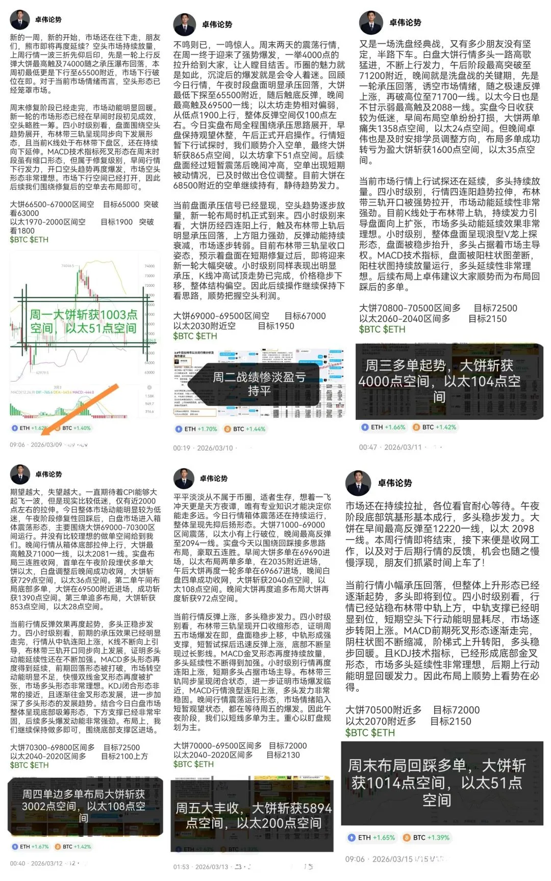 本周实盘29战26胜,周一至周二空单布局战绩较为惨淡,行情承压试底,主要以吸筹为主,布局上9战6胜,大饼仅仅斩获1100点空间,以太62点空间。后期行情逐步反弹上涨,卓伟也是及时调整安排学员多单布局,一路连胜,豪取20连胜。主要围绕回踩接多思路精准布局,大饼12连胜斩获12887点空间,以太8连胜斩获463点空间。本就是因人而异的市场,同样的市场,同样的行情,选对了路就是能够事半功倍。
